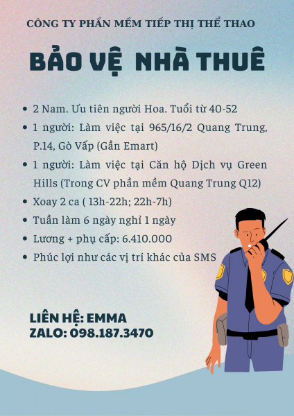 Forums Hot Info News Recruitment Tuyển dụng Bảo Vệ Nhà Thuê 2 years ago Ruby Total views: 137 Vị trí tuyển dụng: NHÂN VIÊN BẢO VỆ NHÀ THUÊ Liên hệ: Ms. Emma (ext: 8021) Zalo: 098.187.3470 Tags: baove hiring housing Recruitment tuyendung Post navigation Previous AWARDS 2023Next Happy Birthday – February / Chúc mừng sinh nhật – Tháng 2